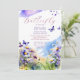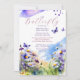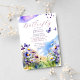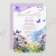 Pequena borboleta, lilás, cor-de-rosa, violetas roxas e margaridas, prado com borboletas roxas, chá de fraldas convite modelo lavanda instantâneo. Flores e borboletas elegantes para um convite de aquarela para um chá de fraldas de menina.
