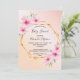 Um elegante convite para chá de fraldas de verão tropical. Com uma falsa estrutura geométrica de ouro decorada com hibisco de rosas claro, flores tropicais com um pouco de verde. Um fundo rosa dourado e cinza rosa-claro. O nome da mãe a ser está escrito com um moderno roteiro de estilo. Texto preto. Fundo: rosa dourado e plano de fundo rosa-claro. Para ambos os sexos neutros ou para celebrar um bebê.