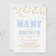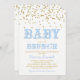 Chá de fraldas com um convite de brunch com palavras bonitinhas e meticulosas para bebês, em um fundo com brilho dourado. Este convite de brunch de chá de fraldas de bebê azul e dourado é facilmente personalizado para o seu evento simplesmente adicionando os seus detalhes no estilo de fonte, cor e texto da sua escolha. Você também pode alterar a cor de fundo. Este é um design impresso sem brilho real.