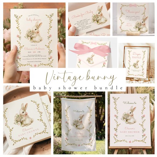 Este design de convite para chá de fraldas de apresenta uma cor d'água branca, cor rosa-d'água, um quadro verde floral e uma adorável garota coelhinha. A bela cor de fundo da névoa serve para um efeito de safra e complementa perfeitamente os tons rosa e verde macios.