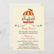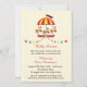 Um convite de chá de fraldas neutro em termos de gênero com carrossel e estrelas festivas que embrulham bandeiras em fundo amarelo pálido com faixas sutis.