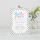 Um convite elegante e elegante do chá de fraldas dos gêmeos para que as mães sejam quem estão esperando gêmeos do menino e da menina. Caracteriza um rosa e um outro carrinho de criança azul com teste padrão de bolinhas. Fundo do fundo cinzento e branco da viga. Personalize facilmente com seus detalhes do partido.