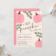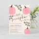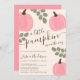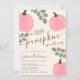 Um belo convite para chá de fraldas de menina de abóbora. Este chá de fraldas de outono moderno apresenta uma letra de escrita de caligrafia de tendência, abóboras cor-de-rosa e ramos verdes de Eucalyptus.