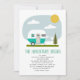 Aventura, chá de fraldas temático, com ilustração da turquesa e do trailer de camper retrô branco com roupas de bebê penduradas na linha de roupas ligadas a cada árvore verde sob um céu azul com sol e nuvens. texto diz "a aventura começa"