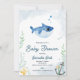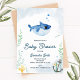 Tema do Tubarão bebê de convite para chá de fraldas. Este convite para chás de fraldas tem ilustrações de aquarela pintadas manualmente, um pequeno tubarão-bebê fofo e elementos submarinos. Perfeito para um chá de tema náutico. Parte do texto é editável.
