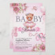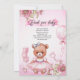Convite para chá de fraldas com uma ilustração adorável de aquarela de um ursinho de pelúcia num vestido rosa fofo.