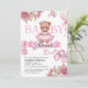 Convite para chá de fraldas com uma ilustração adorável de aquarela de um ursinho de pelúcia num vestido rosa fofo.