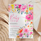 O convite para chás de fraldas de cor floral boêmica, em negrito, com cores vivas, pintado cor-de-rosa, laranja, flores amarelas, folhas de eucalipto verde e folhagem indigo, com uma moderna letra de pincel em branco. Convidado perfeito para Primavera e verão, para o tema da festa de jardim e ao ar livre.