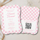 Este design estético de coquete de tendência com um padrão de verificação de arco rosa oferece personalização com o nome da nova mãe, informações de festas e código QR de registro.