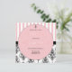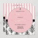 Este convite elegante bonito do chá de fraldas fará toda a mãe para ser special da sensação! Grande quadro center do cirlce nos pontos pretos minúsculos, acentuados com um elemento do damasco do vinatge para que você personalize com toda a informação para seu partido ou chá. A metade superior tem um fundo de branco e as listras cor-de-rosa e a parte inferior têm um damasco preto e branco elegante. Parte dianteira e parte traseira do impressão de cor completa. Apropriado para o aniversário das senhoras ou das meninas, mudança nupcial ou do chá de casamento ou do chá de fraldas simplesmente o texto do convite para seu evento.