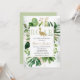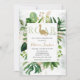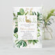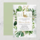 Cercado por verde, este elegante convite para chá de fraldas verde e ouro estabelece um tom elegante e moderno para um chá de fraldas de dinossauro.
