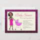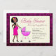 Esses convites para na moda de bebê apresentam uma mulher afro-americana vestindo uma jaqueta de impressão-leopardo e empurrando uma carruagem de bebê rosa com uma sutil impressão animal rosa também! Pronto para personalizar e comprar!