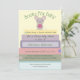 Um convite de chá de fraldas rosa e roxo com o tema trazer um livro para a biblioteca de bebês. design original da Night Owl's Menagerie, 2019.