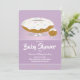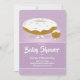 Um convite de chá de fraldas bonito mostrando um sorriso, fosco, rosquinha e um personagem de rosquinha bebê. O convite inclui pulverizações e um esquema de cor roxa. Todas as palavras podem ser personalizadas. A parte de trás do convite tem um padrão de donuts sorridentes. Comida de Rosquinha Fosco bonita Convite para Chá de fraldas Docetsham Comida Arte | ©Melissa Patton — Designer/Ilustrator