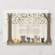 Um convite de chá de fraldas com ilustração de uma raposa, urso, guaxinim, caule, veado e caule sentados no chão da floresta entre duas árvores com folhas verdes. Personalize o texto.