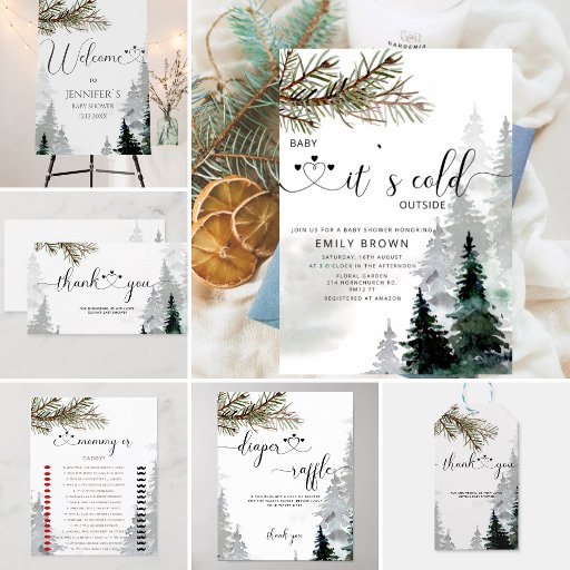 С convites para chuveiros de bebês impressos no inverno, numa bonito paleta de cores neutra em termos de gênero. Este doce design apresenta uma floresta de cor d'água с árvore de natal e um estilo moderno de letra de mão que diz Baby It's Cold Outside - perfeito para o tema do chá de fraldas de inverno rústico. Personalize-o com os detalhes do evento para o bebê ou menina.