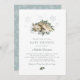Um elegante convite para o chá de fraldas de inverno para a mãe ser. Design apresenta uma ilustração aquosa de um veado bebê enrolado em um leito de verde na neve. Flocos de neve imersos acendem o design. Este convite de chá de fraldas de feriado sazonal apresenta um esquema de cor neutro de branco, azul verde, sábio, cinza, ardósia e bronzeado natural que funciona bem para um bebê ou como um convite neutro em termos de gênero. Um padrão coordenado de flocos de neve se veste na parte de trás da carta.