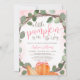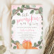 Um modelo de convite para chá de fraldas de menina caindo, com uma faixa de cor d'água eucalipto, abóboras laranja, arco de fita rosa e letra de caligrafia de tendência.