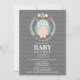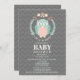Um convite do chá de fraldas que caracteriza uma ilustração de uma coruja dentro de uma grinalda decorada com flores, folhas, e uma bolota. Personalize o texto.