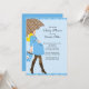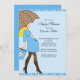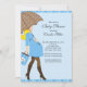 Comece seu doce chá de fraldas de bebê com nossa mãe loira moderna para segurar um guarda-chuva de bolinhas castanho e azul sobre um fundo de bolinhas azul. Visite nosso compro para uma grande seleção de convites para um chá de fraldas de bebê.