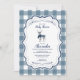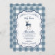 Comemore no estilo aconchegante do inverno com este charmoso convite para chás de fraldas. Uma doce rena aquática fica no centro de um clássico fundo de xadrez azul, enquadrado por um rótulo escalpado com talo de safra — perfeito para receber um menino durante o feriado.