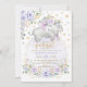 Bem-vindos ao seu doce amendoim com este convite para chás de fraldas femininos. Apresentando rosas roxas elegantes, verde botânico suave em verde e ouro, e um adorável elefante bebê adormecido deitado em uma bonito lua de lavanda. Clique no botão "personalizar mais" se quiser reorganizar e formatar o estilo e a posição do texto. Vem com uma faixa cor-de-rosa e dourada correspondente na parte de trás.
