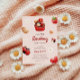 Convite ao chá de fraldas com ilustrações de lovebug, cupcake, flor e morango bonitinho, todas num esquema de cores vermelho, branco e castanho claro. Em conjunto com as ilustrações estão uma fonte de script divertida e um sans serif elegante no qual todas as informações personalizadas são escritas. Veja na nossa loja mais itens desta coleção.