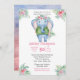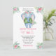 Elefante de aquarela branca rodeado por flores cor-de-rosa. O convite perfeito para chás de fraldas de amantes de animais. A parte traseira da placa é cor-de-água rosa e azul. Faça com que a mãe seja chá de fraldas especial com este convite para temas coloridos e bonitos de elefante de chá de fraldas.