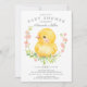 Design de chá de fraldas bonito com o pintinho de bebê mais doce com um delicado laurel de flor rosa. Sacudir o nosso convite para ver uma floral coordenada de volta para um toque especial extra. Visite o nosso compro para ver este design para um chá de fraldas de rapazes.