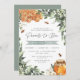 Os convites de chá de panela com tema de abelhas elegantes e caprichosas apresentam uma fronteira de folhagem botânica verde, flores brancas cor de laranja, favos de mel e um boião de mel com abelhas buzinas. "Por favor, junte-se a nós para um chá de fraldas honrando os pais a ser" aparece no centro, com seus detalhes de chá de fraldas embaixo das letras de cinza mole.
