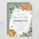 Os convites de chá de panela com tema de abelhas elegantes e caprichosas apresentam uma fronteira de folhagem botânica verde, flores brancas cor de laranja, favos de mel e um boião de mel com abelhas buzinas. "Por favor, junte-se a nós para um chá de fraldas honrando a mãe a abelha" aparece no centro, com seus detalhes de chá de fraldas embaixo das letras de cinza mole.