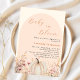 Um bebê elegante no convite de Chá de fraldas Bloom. Um fundo creme, cor bege e um arco colorido de pêssego. Decorados com flores silvestres de cor aquosa em bege, rosa e uma abóbora de cor creme.