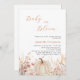 Um bebê elegante no convite de Chá de fraldas Bloom. Um fundo branco decorado com flores silvestres de cor aquosa em bege, rosa e uma abóbora de cor creme.