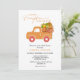Um cartão de convite para chás de fraldas moderno e na moda com uma abóbora laranja queimada numa fotografia de automóvel. De acordo com o texto, "um pouco de abóbora está a caminho." Ideal para o chá de um menino perto da Ação de Graças.