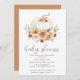 Outono outono Floral Chá de fraldas de Abóbora Abóbora Convite Ouvido Abóbora floral cor Quente Convite de chá de fraldas com um adorável arranjo floral e uma abóbora branca. Este convite para chás de fraldas de outono também apresenta um título de caligrafia moderna e um coração pequeno. Ideal para quem tem um chá de fraldas neutro em termos de gênero ou outono.