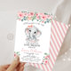 Capture a alegria da antecipação com nosso adorável convite de chá de menina floral cor-de-rosa com um elefante encantador adornado com um arco. Compartilhe a entusiasmo de receber seu pequeno amendoim com este delicioso cartão de convite.
