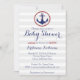 Estes adoráveis convites náuticos de âncora são perfeitos para ambos os chás de fraldas de menina e menino! Eles apresentam um fundo listrado de cinza leve. Em cima do fundo está um círculo de corda vermelho que contém uma âncora azul marinho.