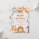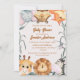 Cartões de convite para chás de fraldas, russos e caprichosos, em áreas florestais, com ilustração de uma Girafa, leão, zebra, elefante, coruja e raposa. Esta design é neutra em termos de gênero.