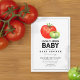 O mercado russo inspirou o tema do chá de fraldas neutro em relação ao gênero, apresentando um tomate vermelho e verde sobre fundo branco com texto preto.