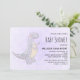 O chá de bebê convoca com uma ilustração fofinha com um dinossauro roxo cinza.