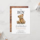 Um convite para chás de fraldas rústico giro, com um ursinho de pelúcia, e madeira branca e castanho, lavada no verso do convite. Para uma vibração moderna rústica, com a frase "oh boy"! Tipografia castanha e preta.