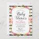 design de convite para chá de fraldas de apresenta texto preto e rosa claro e macio que pode ser totalmente personalizado para o evento especial, enquadrado por um acordo floral de cor d'água bonito com folhagem verde e cor-de-rosa pastel, pincel, primavera de pêssego e flores rosa. Um padrão de listras de chalkboard preto macio acentua o design. A design de dois lados inclui uma foto de maternidade ou ultrassom com o gênero do bebê (ou outro texto) e armazena informações de registro nas costas com uma cor de fundo de rosa claro.