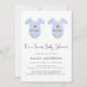 Celebrar a futura mãe de gêmeos rapazes com este belo convite para o chá de fraldas, que inclui cores azuis pastel e douradas de roupas de bebê um, com "É um Rapaz!" escrito através do livro. "É um Chá de fraldas Gêmeo" é escrito por baixo em um roteiro na moda contemporâneo.