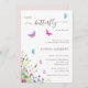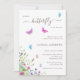 Uma borboleta está a caminho! Esses convites para bebês de aquarelas apresentam um bonito jardim de flores silvestres adornados com borboletas azuis, rosa, roxas e acompanhados por tipografia elegante de scripts. Perfeito para chás de fraldas de sexo neutro, rapazes ou raparigas. Personalize-os com seus detalhes e utilize a ferramenta de edição para fazer outros ajustes, como tamanho da fonte, posicionamento ou cor.