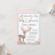 Chamadas de vitrine para bebês com belos veados de aquarela com flores bonito e penas num fundo floral rosa e azul-lacrimogênio pintado. Estes convites para o chá de bebê de veados são facilmente personalizados para o seu evento simplesmente adicionando os seus detalhes. Você também pode alterar a cor de fundo na frente e no verso.