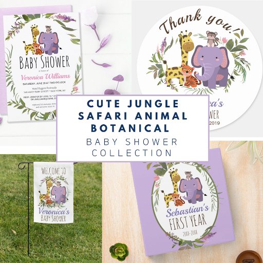 Esta design bonitinha apresenta um elefante, girafa, tigre, e um macaco rodeado por um padrão de folha botânica. Essa tipografia popular pode ser personalizada para mudar a cor e o estilo da fonte ou mantê-la como é para sua conveniência. Tão fofo para um menino ou chá de fraldas de menina.