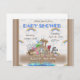 Chá de fraldas de convite para bebê em azul apresentando a Arca de Noah com todos os animais, nuvens e arco-íris no fundo "Chá de fraldas" em azul no topo e bordado em listras marrons e personalizável para fazer isso para seu próprio convite de festas.