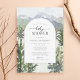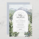 Um convite à chá de fraldas da floresta de coloração aquática moderna. Design apresenta árvores pintadas manualmente e montanhas. O quadro de arco de tendências e a letra do script de caligrafia adicionam um toque elegante a este modelo de convite de chá de fraldas de temas externos rústicos.