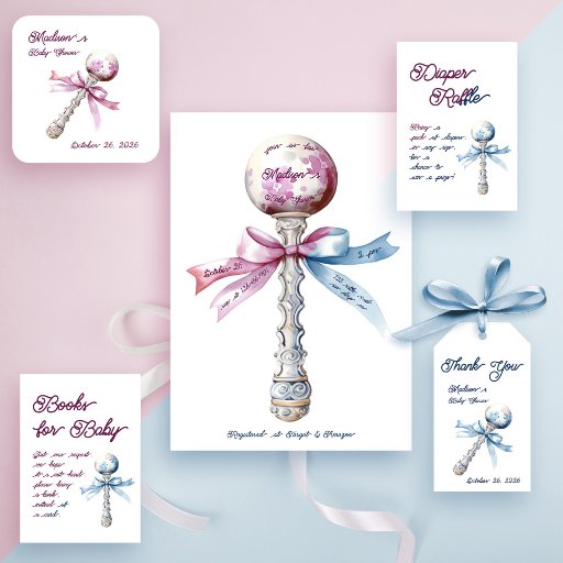 Apresentando um delicado chocalho pintado à mão em tons prateados suaves e cor-de-rosa, acentuado com um arco gracioso, esse design minimalista expele encanto e sofisticação. Os detalhes elegantes parecem dançar através do layout, criar uma luz e ser arejado se sentem perfeitos para um chá de menina refinado. A disposição limpa e moderna faz deste convite uma escolha eterno para aqueles que apreciam o sutil luxo e a beleza artística. Ideal para uma celebração de chá de fraldas clássica ou elegante. Por favor, entre em contato conosco para assistência à design via Zazzle Chat. Estaremos certos de que responderemos dentro de 12 horas.
