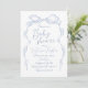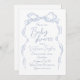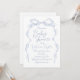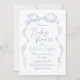 Os convites para bebês elegantes apresentam um arco de fita desenhado à mão com fontes modernas de script manuscrito em azul empoeirado, limpo e simples. Excelente para chá de fraldas caprichoso único. Veja todas as peças correspondentes na coleção.